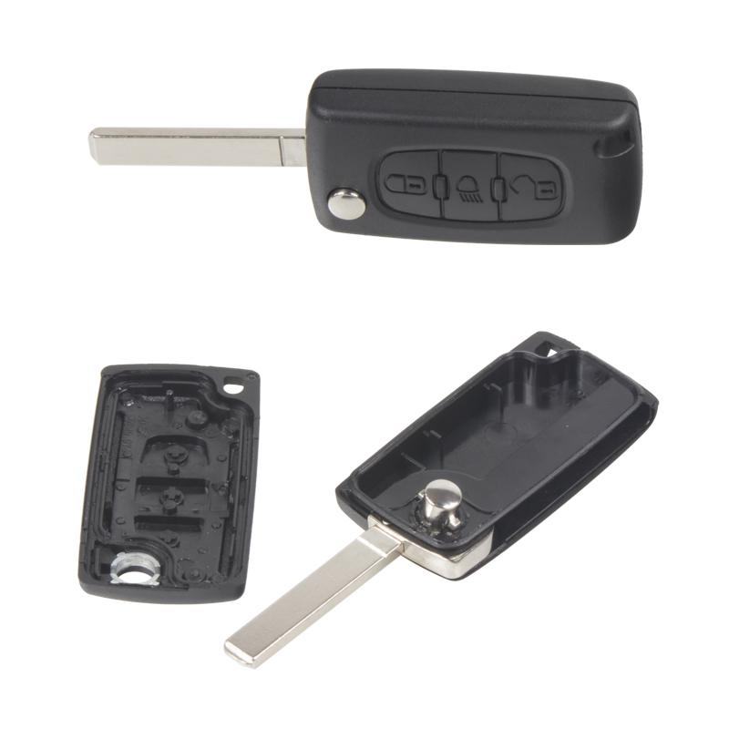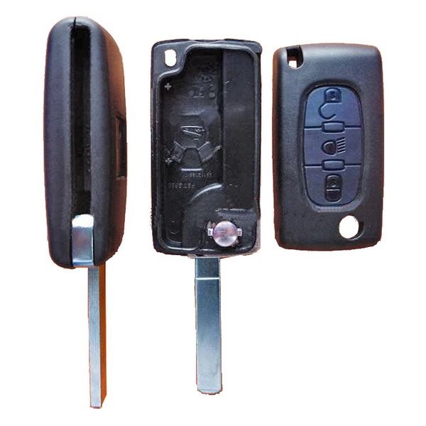 Náhradní obal vystřelovacího klíče pro vozy koncernu Peugeot s 3-tlačítkovým ovladačem (bez elektroniky a čipu imobilizéru) a se symbolem světla. Planžeta klíče VA2, baterie je umístěna přímo na plošném spoji ovladače. Do klíče je nutno vložit z původního klíče elektroniku dálkového ovládání a čip imobilizéru (transpondér), planžetu klíče je třeba nechat vyfrézovat podle tvaru originálního klíče.