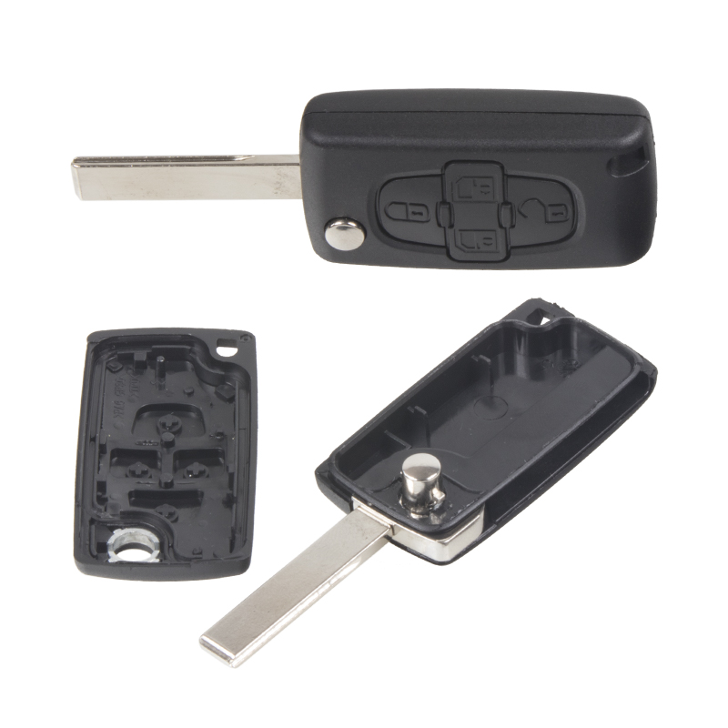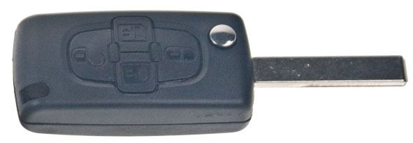 Náhradní obal vystřelovacího klíče pro vozy koncernu Peugeot s 4-tlačítkovým ovladačem (bez elektroniky a čipu imobilizéru). Planžeta klíče HU83, baterie je umístěna na plošném spoji ovladače. Do klíče je nutno vložit z původního klíče elektroniku dálkového ovládání a čip imobilizéru (transpondér), planžetu klíče je třeba nechat vyfrézovat podle tvaru originálního klíče.