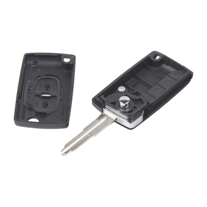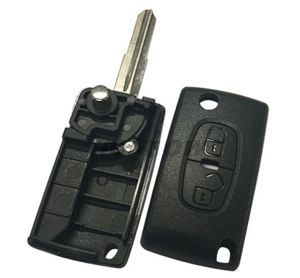 Náhradní obal vystřelovacího klíče pro vozy koncernu Peugeot/Citroën s 2-tlačítkovým ovladačem (bez elektroniky a čipu imobilizéru). Planžeta klíče typu Mitsubishi, baterie je umístěna samostatně v obalu klíče. Do klíče je nutno vložit z původního klíče elektroniku dálkového ovládání a čip imobilizéru (transpondér), planžetu klíče je třeba nechat vyfrézovat podle tvaru originálního klíče.
