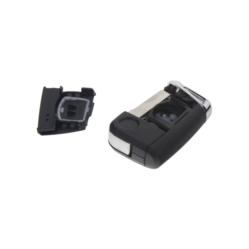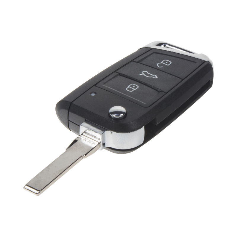 Náhradní obal vystřelovacího klíče pro vozy koncernu VW (modely 2014-) s 3-tlačítkovým ovladačem (bez elektroniky a čipu imobilizéru). Do klíče je nutno vložit z původního klíče elektroniku dálkového ovládání a čip imobilizéru (transpondér), planžetu klíče je třeba nechat vyfrézovat podle tvaru originálního klíče.