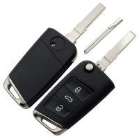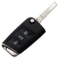 Náhradní obal vystřelovacího klíče pro vozy koncernu VW (modely 2014-) s 3-tlačítkovým ovladačem (bez elektroniky a čipu imobilizéru). Do klíče je nutno vložit z původního klíče elektroniku dálkového ovládání a čip imobilizéru (transpondér), planžetu klíče je třeba nechat vyfrézovat podle tvaru originálního klíče.