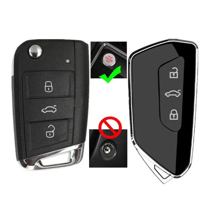 Náhradní obal vystřelovacího klíče pro vozy Volkswagen, Škoda a Seat s 3-tlačítkovým nevystřelovacím klíčem(bez elektroniky a čipu imobilizéru). Slouží pro změnu ze staršího nevystřelovacího klíče na novější verzi. Do klíče je nutno vložit z původního klíče elektroniku dálkového ovládání a čip imobilizéru (transpondér), planžetu klíče je třeba nechat vyfrézovat podle tvaru originálního klíče.