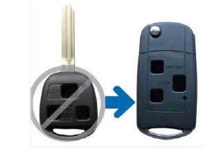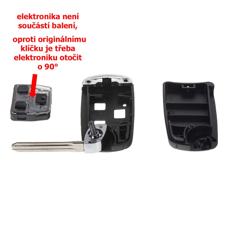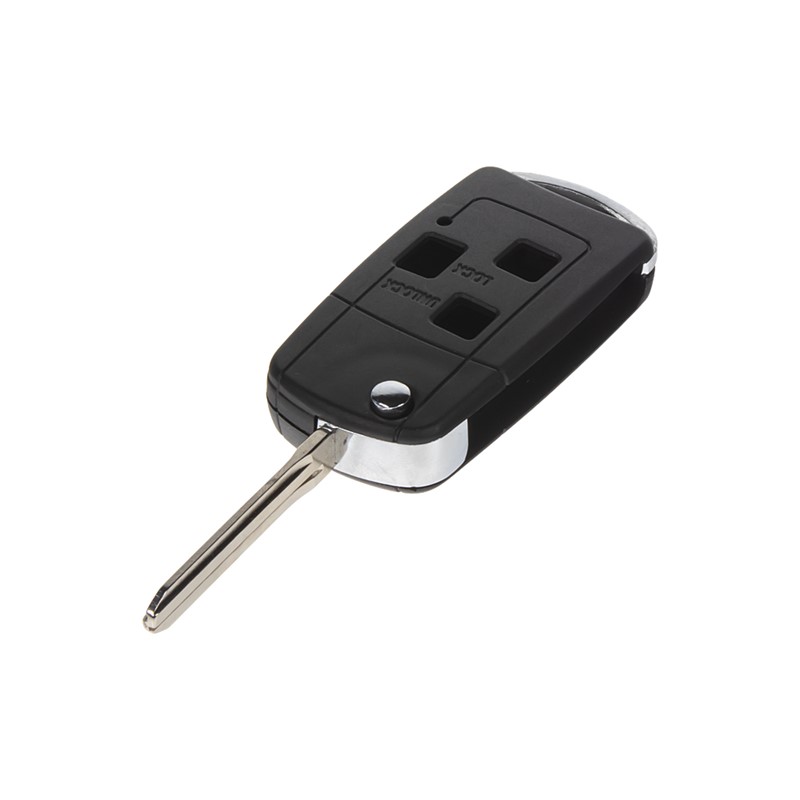 Náhradní obal vystřelovacího klíče pro vozy Toyota s 3-tlačítkovým nevystřelovacím klíčem (bez elektroniky a čipu imobilizéru). Slouží pro změnu ze staršího nevystřelovacího klíče na novější verzi s vystřelovacím klíčem. Do vystřelovacího klíče je nutno vložit z původního klíče elektroniku dálkového ovládání a čip imobilizéru (transpondér), planžetu klíče je třeba nechat vyfrézovat podle tvaru originálního klíče.