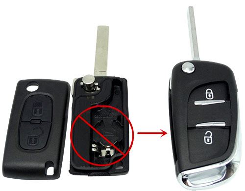 Náhradní obal vystřelovacího klíče Citroën s 2-tlačítkovým nevystřelovacím klíčem (48CT101) (bez elektroniky a čipu imobilizéru). Slouží pro změnu ze staršího vystřelovacího klíče na novější verzi s vystřelovacím klíčem. Do klíče je nutno vložit z původního klíče elektroniku dálkového ovládání a čip imobilizéru (transpondér), planžetu klíče je třeba nechat vyfrézovat podle tvaru originálního klíče.