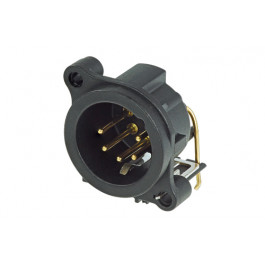 5-pólový XLR konektor, samec, uzemnění: samostatný zemnící kontakt na stínění konektoru a panelu, PBC montáž horizontální.