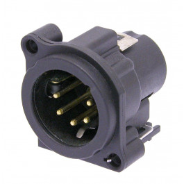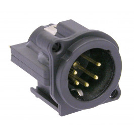 5-pólový XLR konektor, samec, uzemnění: samostatný zemnící kontakt na stínění konektoru a panelu, PBC montáž vertikální.