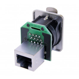 Průchodka - panelový konektor RJ45, D-Série s kovovou přírubou, pojistka proti nechtěnému vytáhnutí samce, montážní šroubky součástí.