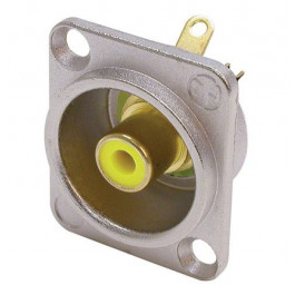 Panelový RCA (Cinch) konektor, poniklované pouzdro D-rozměr, izolace vnitřního kontaktu žlutá, pájecí verze.