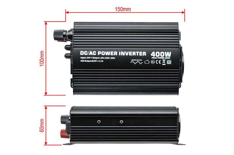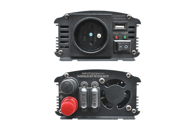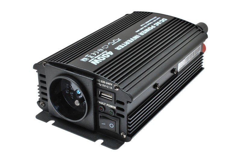 Vhodný provoz ledniček, příručního nářadí, světlometů atd. v automobilu. Připojuje se a napětí 24V do palubní sítě automobilu pomocí kabelů (součást dodávky). Výstupní napětí na zásuvce je 220V, trvalá zatížitelnost je 400W, špičkově 800W. Chlazení ventilátorem.