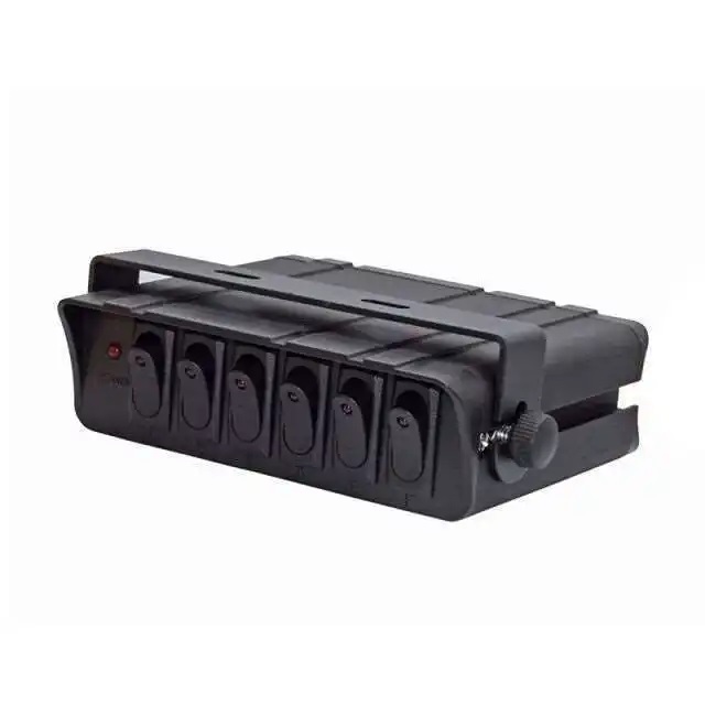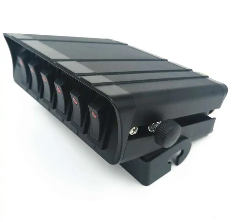 Panel se 6-ti přepínači, vhodné např. pro přídavná doplňková světla, majáky, predátory a světelné aleje. Obsahuje 6 spínačů s červenou LED kontrolkou v zapnuté poloze. Upevnění pomocí plechového držáku (součást balení).