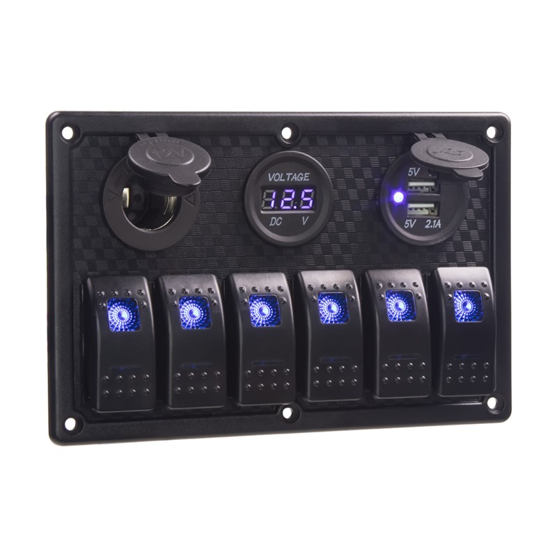 Krátký popis Panel s 6x spínači Rocker, CL a 2x USB zásuvka + voltmetr.   Technické parametry: • napájec