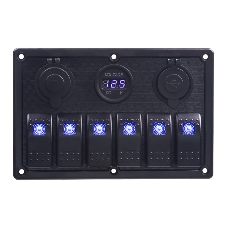 Panel s 6x spínači Rocker, voltmetr, CL + USB zásuvka, 12/24V
