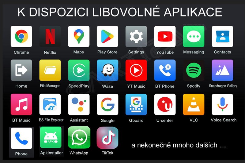 - možnost instalace libovolných aplikací z Obchod Play (Google mapy, iVysílání, Netflix, Spotify, Waze, YouTube...)