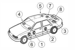 - umístění reproduktorů: *1) - přední dveře / *2) - zadní dveře