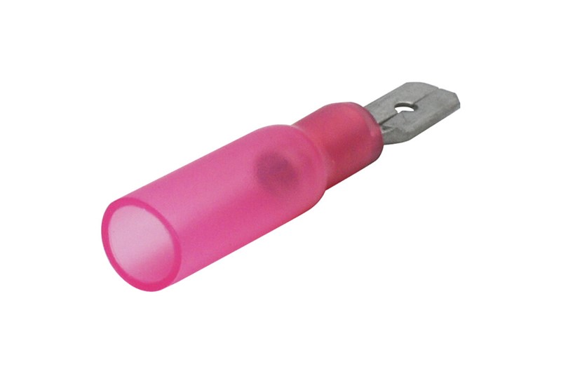 Poloizolovaný konektor faston - samec plochý 4,8 x 0,8mm izolovaná teplem smrštitelnou trubicí s lepidlem.
