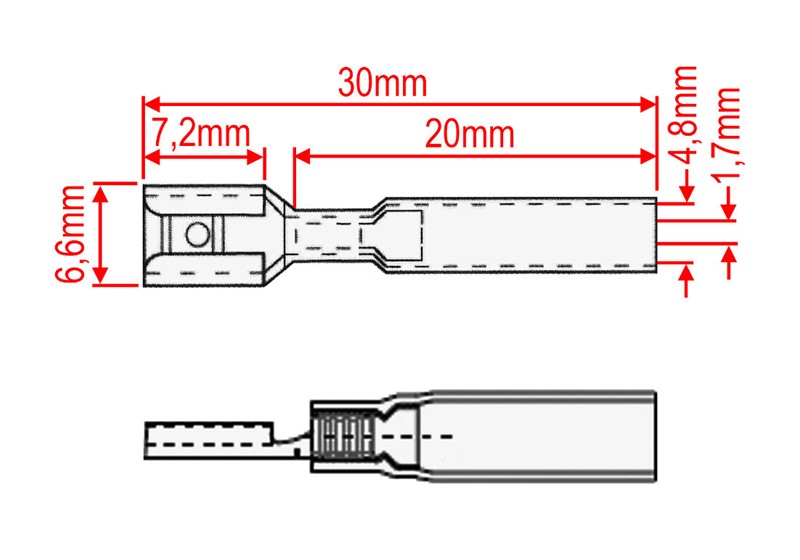 Poloizolovaný konektor faston - samice plochá 6,3 x 0,8mm izolovaná teplem smrštitelnou trubicí s lepidlem.