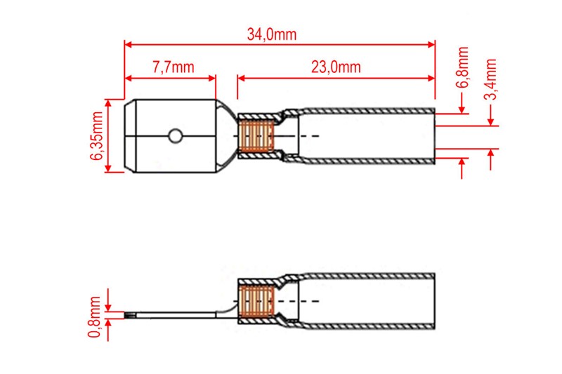 Poloizolovaný konektor faston - samec plochý 6,3 x 0,8mm izolovaná teplem smrštitelnou trubicí s lepidlem.