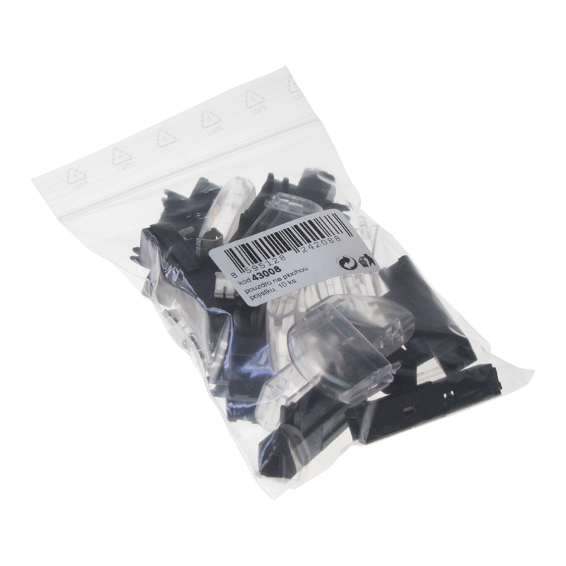 Krátký popis Pojistkové pouzdro na plochou pojistku do 10A.   • 1 sada obsahuje 2x PIN, 1x pouzdro, 1x kryt • balení obsahuje 10 sad, cena za 1 bal