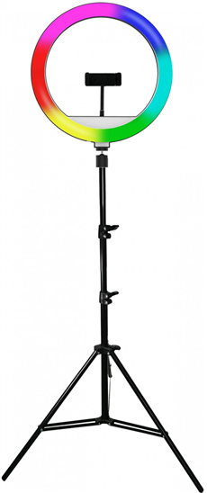 Krátký popis Kruhové světlo Powerton 13", RGB LED, velké, nastavení barev a svítivosti, držák telefonu a stativ