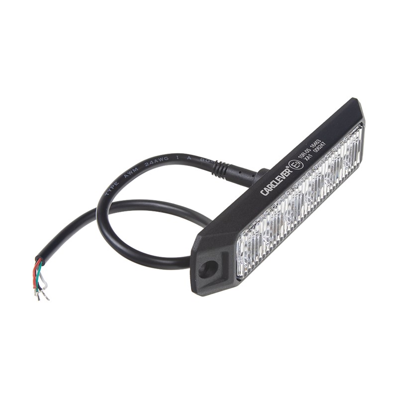 Krátký popis Přídavné oranžové výstražné LED světlo pro externí povrchovou montáž.   Technické parametry: • homologace ECE R65, ECE R10 • 6x vysoce výkonné LED diody 1 W • IP 67 • minimální odběr proudu • 11 různých přednastavených programů pro blikání • synchronizace s dalšími LED světly stejného typu • odolná konstrukce chránící proti vlhkosti a otřesům • dlouhá životnost • rozměry 130 x 28 x 12,3 mm • napájecí napětí 12–24 V   Zapojení: • červený + 12 / 24 V • černý – zem • zelený vodičem se mění program blikání (na + 12 / 24 V) pokud je třeba synchronizovat s dalšími světly, musí být zelené dráty spojeny • bílý vodič připojením (na + 12 / 24 V) dojde k protichůdnému blikání (připojit jen jedno světlo ze dvou)
