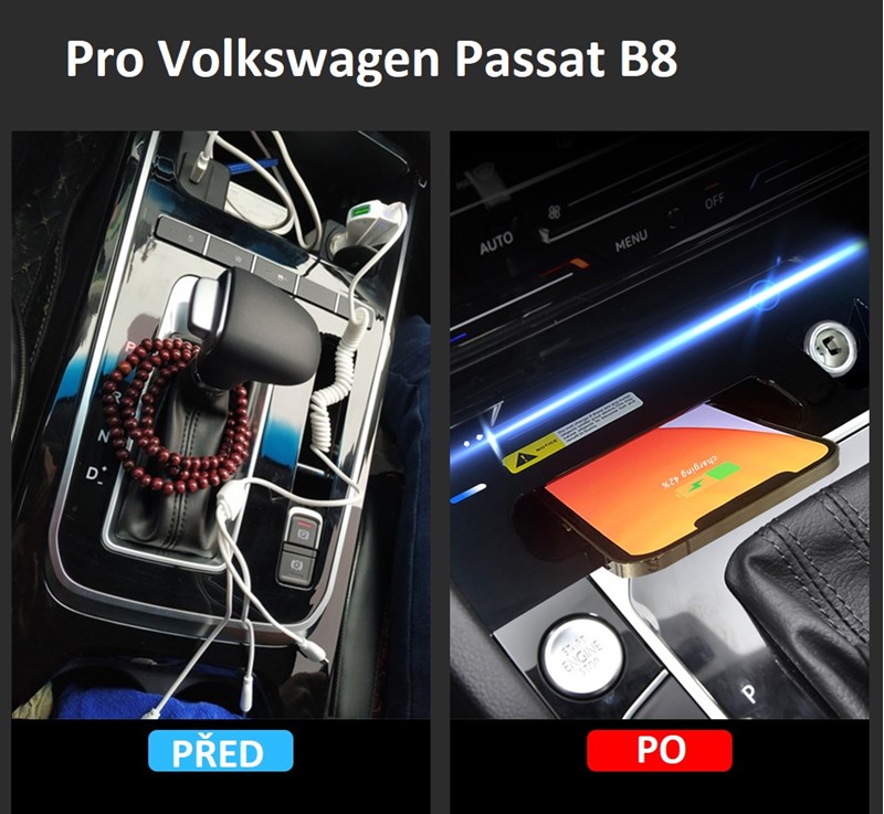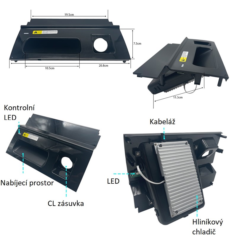 Nabíjecí přihrádka pro bezdrátové dobíjení mobilních telefonů prostřednictvím technologie Qi.