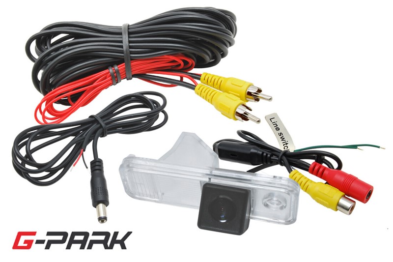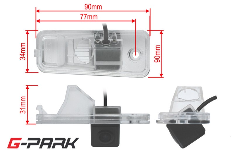 CCD parkovací kamera pro instalaci do lampy pro osvětlení zadní registrační značky. Součástí kamery je místo pro umístění patice se žárovkou z původního světla pro registrační značku.