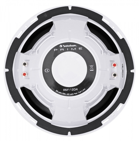 MARINE - speciální voděodolný subwoofer určený pro lodě, jachty, nebo do venkovních prostorodolné vůči slané vodě a UV záření.RM112D4 Prime R1 12 "Marine Subwoofer s luxusní mřížkou.12 "Prime R1 série Dual 4-Ohm MARINE subwooferŠpička: 400 wattůRMS: 200 wattůDoporučený rozsah výkonu: 75 - 200 Wattů RMS /CEA-2031 kompatibilníKlippel VerifiedVstřikovaný polypropylenový kužel vyplněný minerálemOdolný proti UV záření a solné mlze2 "4-vrstvá hliníková cívka100% UV stabilní ASA vstřikované plastové dílyUltralehký plně izolovaný silikonový olověný kabelVlastní, vůči korozi odolné pružinové svorkyodolnost vůči roztržení a únavě, pavouk z aramidových vláken /Včetně odnímatelného obložení / mřížkyŠroubovací svorky s připojením kabeláže do 12AWGHorní hloubka montáže: 4,81"Průměr výřezu: 10,87"Frekvenční odezva: 22 - 250 HzFs: 29 HzQts: 0,64Vas: 3,83 ft³Xmas: 7,0 mmCitlivost: 88 dBOptimálně uzavřené skříně: 1,65 ft³Optimální basreflex: 2,45 ft³Kompatibilní s nekonečným deflektoremK dispozici také v černé barvě: Rockford Fosgate RM112D4B