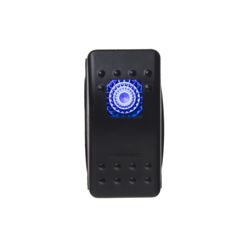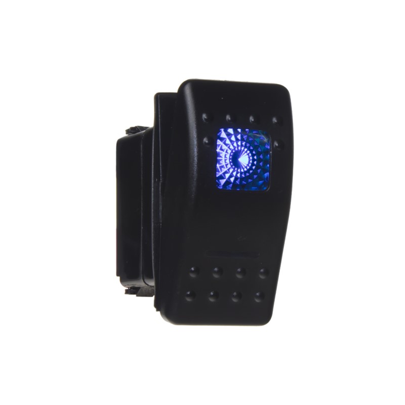 Spínač ROCKER kolébkový hranatý s modrým LED podsvícením, pro napájecí napětí 12 V / 20 A - 24 V / 10 A, rozměr otvoru 38 x 22 mm.