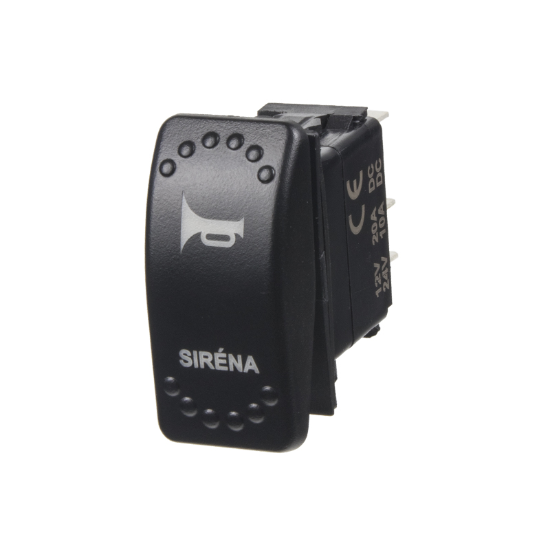 Tlačítko ROCKER kolébkové hranaté s červeně podsvíceným symbolem sirény a nápisem SIRÉNA, pro napájecí napětí 12 V / 20 A - 24 V / 10 A, rozměr otvoru 37 x 21 mm, LED podsvícení.