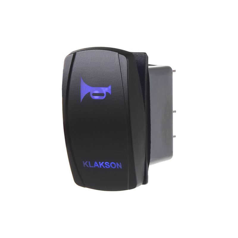 Spínač (tlačítko) ROCKER2 kolébkový hranatý s modře podsvíceným symbolem trumpety a nápisem KLAKSON, pro napájecí napětí 12 V/20 A - 24 V/10 A, rozměr otvoru 37 x 21 mm, LED podsvícení.