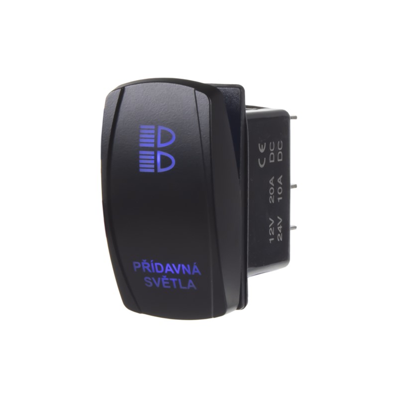Krátký popis Spínač ROCKER2 kolébkový hranatý s modře podsvíceným symbolem světel a nápisem PŘÍDAVNÁ SVĚTLA, pro