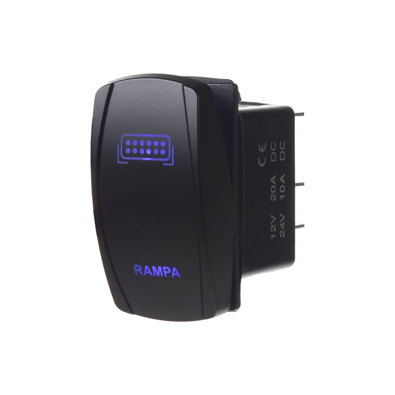 Spínač ROCKER2 kolébkový hranatý s modře podsvíceným symbolem rampy a nápisem RAMPA, pro napájecí napětí 12 V/20 A - 24 V/10 A, rozměr otvoru 37 x 21 mm, LED podsvícení.