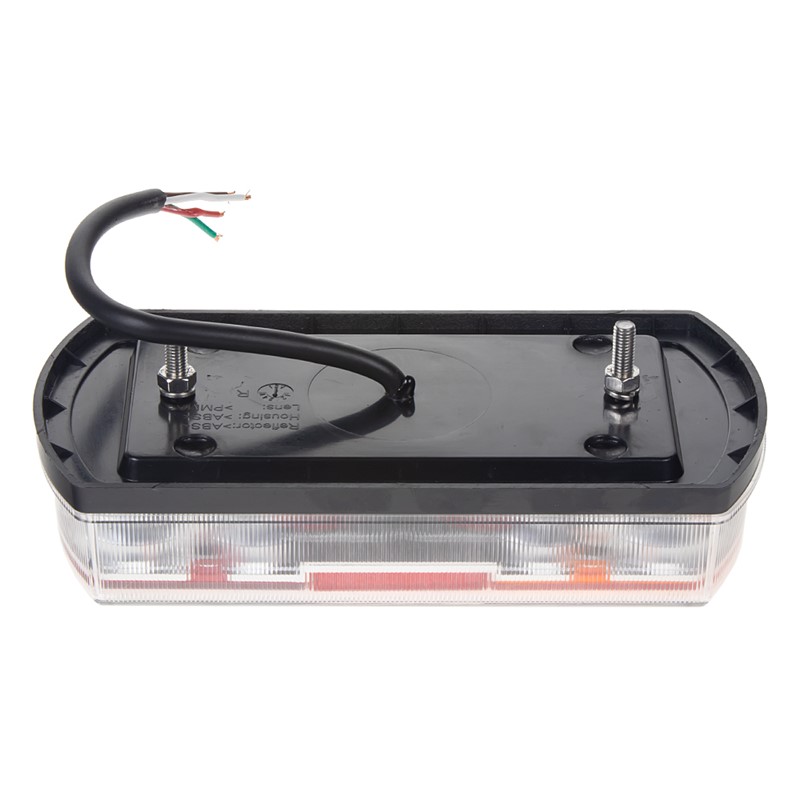 Krátký popis Sdružená lampa zadní - pravá   Technické parametry • napájení: 12-24 V • směrové (6x LED), brzdové/poziční (6 LED), osvětlení registrační značky (3x LED) • odrazový element - obdélník (63 x 40 mm) • rozměry: šířka 164,7 mm, výška 79,8 mm, hloubka 35,4 mm, • rozteč upevňovacích šroubů: 100 mm • včetně LED diod • homologace E4 • vodotěsné IP67   Připojení vodičů • bílý vodič - kostra • hnědý vodič - poziční světlo + osvětlení SPZ • červený vodič - brzdové světlo • zelený vodič - směrové světlo