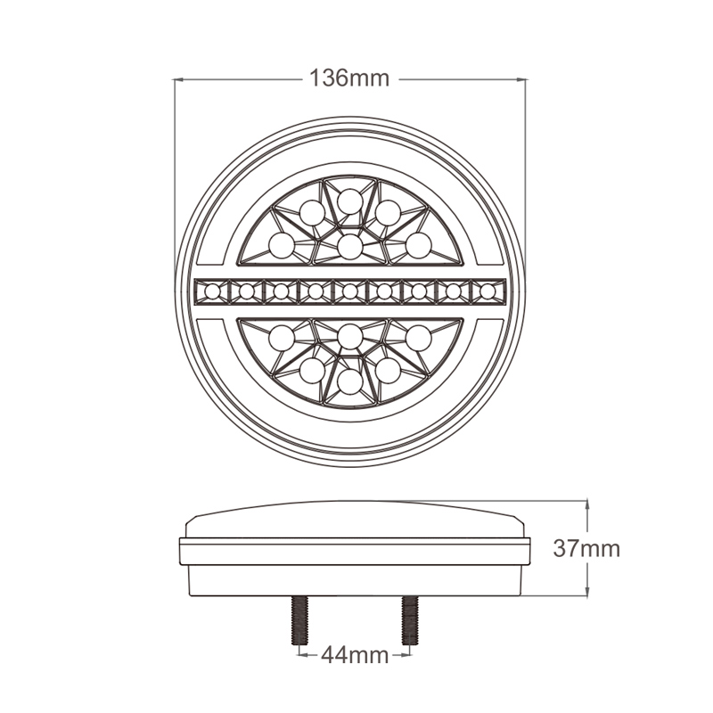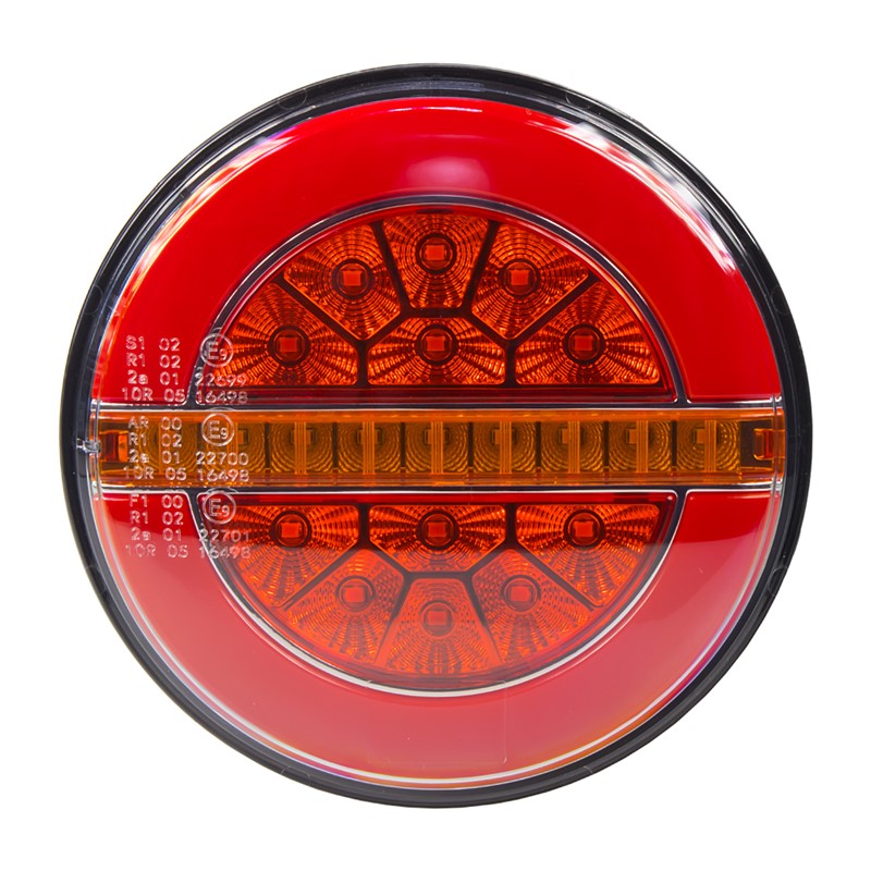 Krátký popis Sdružená LED lampa zadní s dynamickými blinkry 12/24V   Technické parametry • napájení 12/24 V • dynamické směrové (9x LED), brzdové (12x LED) a poziční světlo (24x LED) • rozměry: ø 136 x 30 mm • rozteč montážních otvorů 44 mm • vodotěsné IP67 • homologace ECE R6, R7, R10   Připojení vodičů • bílý vodič - zem • černý vodič - poziční světla • červený vodič - brzdové světlo • žlutý/zelený vodič - směrové světlo