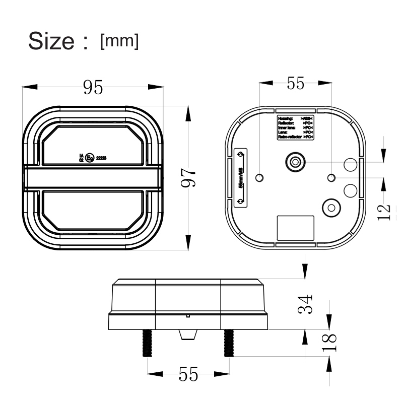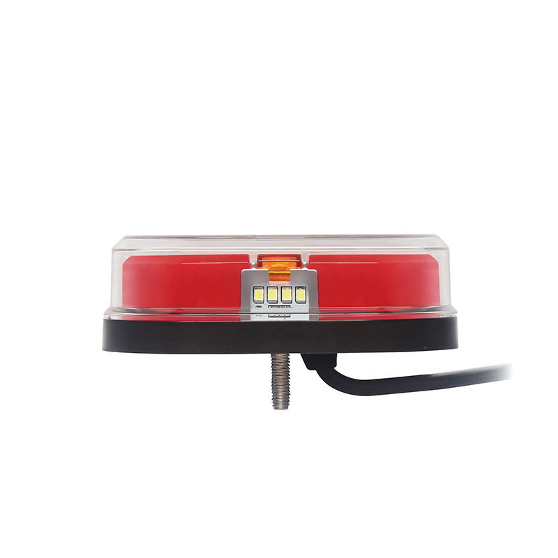 Krátký popis Sdružená LED lampa zadní s dynamickými blinkry 12/24V   Technické parametry • napájení: 12/24 V • dynamická směrová světla • odrazka • směrové (5x LED), poziční (24x LED), brzdové (8x LED), osvětlení registrační značky (4x LED) • homologace ECE R3, R6, R7, R10, R148 • rozměry: výška 110 mm, šířka 108 mm, hloubka 34 mm, rozteč upevňovacích šroubů 55 mm • vodotěsné IP67 • balení: 2 světla (pár)   Připojení vodičů • bílý vodič - kostra • černý vodič - poziční světlo + osvětlení SPZ • červený vodič - brzdové světlo • žlutý/zelený vodič - směrové světlo