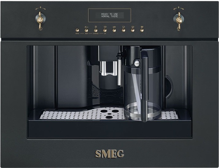 Kompaktní Espresso automatický kávovar, 45 cm, antracitově černý, v designu starožitné mosazi, bílý LCD-Display Weiß ve 2 řádcích, 4 druhy horkých nápojů, funkce páry, Cappuccino-napěňovač mléka, nádoba na mléko, ocelový mlýnek na kávu
