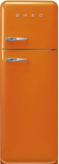 50's Style, 172x60 cm, manual defrost, invertor, barva oranžová, panty napravo, přihrádka s nulovou zónou Life Plus 0 °C, šuplíky na válečkových pojezdech, Multifflow-recirkulace chladného vzduchu, LED-vnitřní osvětlení, celková kapacita 294 l (222 l chladnička + 72 l mraznička), en.třída D, 37 dB(A
