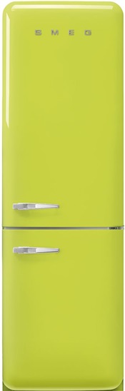 Krátký popis 50's Style, 197x60 cm, No Frost, invertor, barva limetkově zelená, panty napravo, přihrádka s nulovou zónou Life Plus 0 °C, šuplíky na válečkových pojezdech, Multifflow-recirkulace chladného vzduchu, LED-vnitřní osvětlení, externí displej, samostatná regu