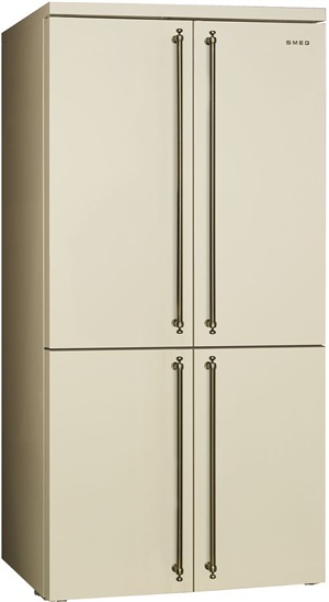 Cross door americká chladnička, 4-dvéřová, 187x92 cm, No Frost, invertor, barva krémová, externí madla/Logo v barvě starožitné mosazi, Active-Fresh Blue-Light, přihrádka s nulovou zónou Life Plus 0 °C, šuplíky na válečkových pojezdech, Multifflow-recirkulace chladného vzduchu, LED-vnitřní osvětlení,