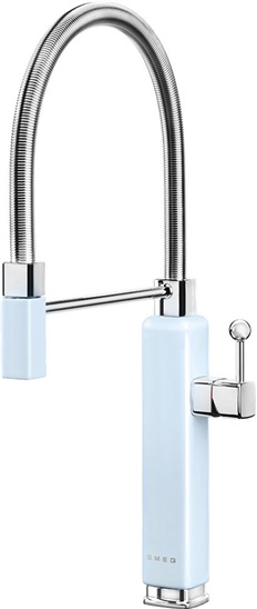50's Style, páková baterie, výška 482 mm, barva pastelově modrá, chromové aplikace, otočné rameno z nerezové oceli vedené spirálovou pružinou, poloprofesionální ruční sprcha s 1 proudovým systémem, funkce úspory energie ESC