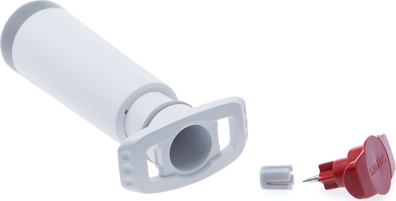 Před použitím pumpy vyjměte červený děrovač z rukojeti vakuové pumpy. Aby se zabránilo ztrátě, univerzální vakuové kolíky jsou uloženy uvnitř pumpy.