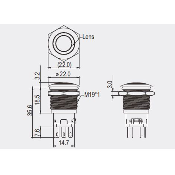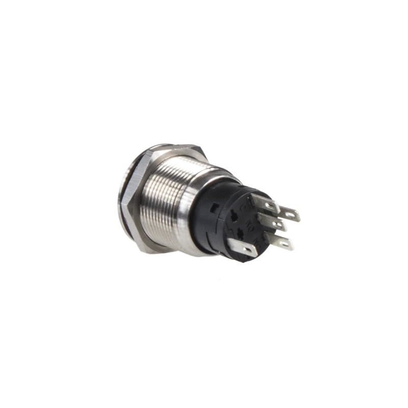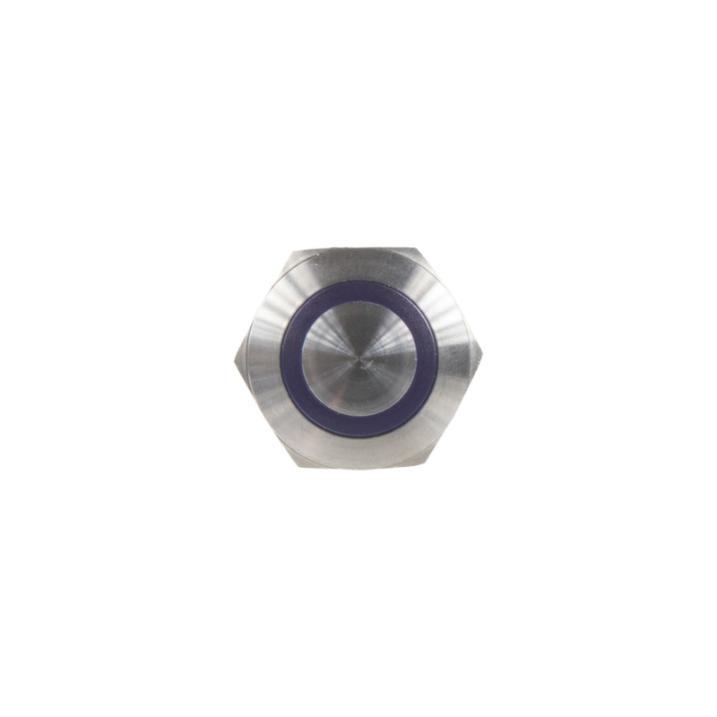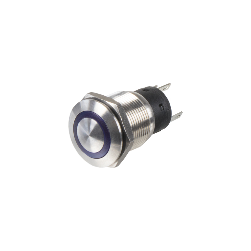 Krátký popis Tlačítko kulaté kovové, modré podsvícení.   Technické parametry • napájecí napětí podsvícení: 12 V • maximální zatížení: 10 A • modré LED podsvícení • 1x kontakt spínací + 1x kontakt rozpínací • připojení pomocí kontaktů 2,8 mm • dielektrická pevnost: AC 500 V 1 minuta • izolační odpor DC500V 100 MΩ min • rozměry: ø22 x 35,6 mm • montáž do otvoru ø19 mm
