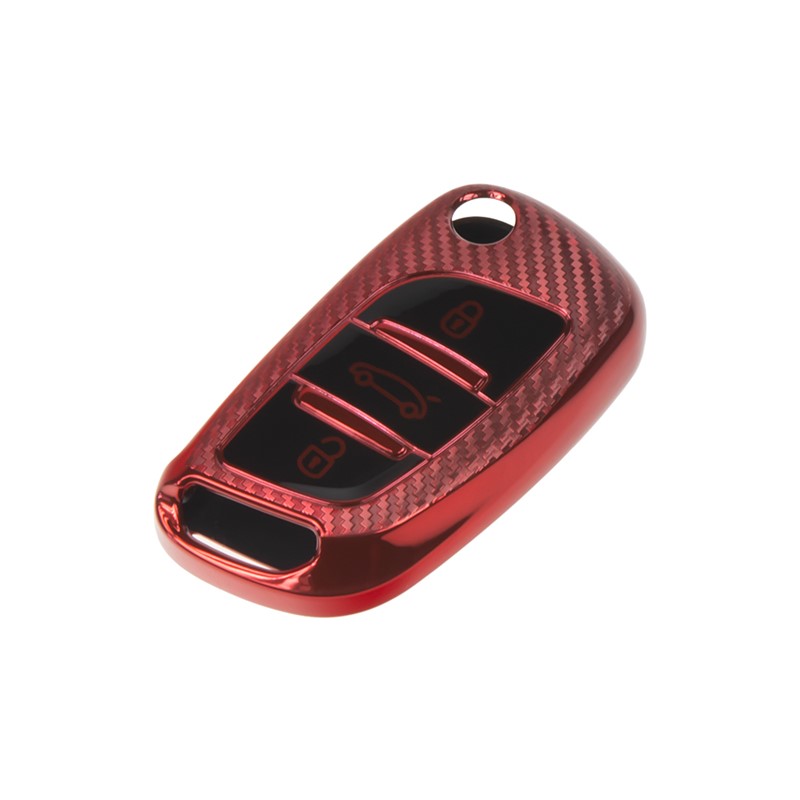 Krátký popis TPU obal pro autoklíč Peugeot/Citroën, 3-tlačítkový, červený s carbonovým vzorem. Chrání klíč pře