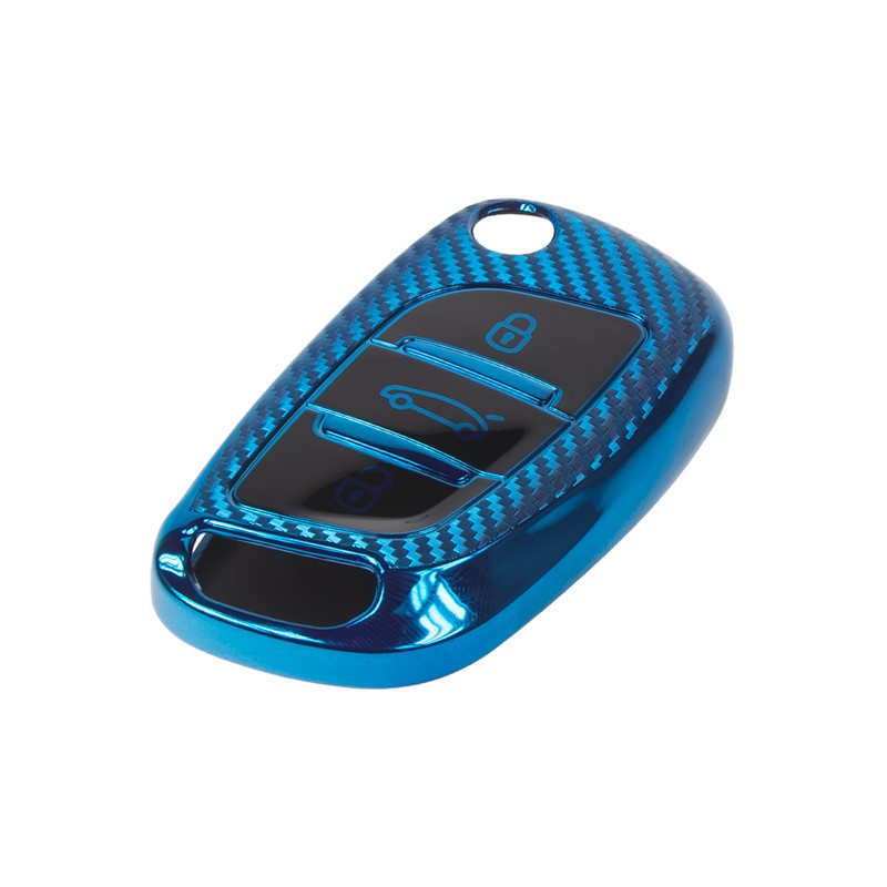 Krátký popis TPU obal pro autoklíč Peugeot/Citroën, 3-tlačítkový, modrý s carbonovým vzorem. Chrání klíč před