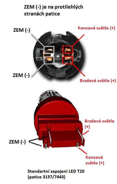 Upozornění: Dbejte prosím na správné zapojení patice ve vozidle (viz. přiložené foto). Při jiném zapojení patice může dojít k poškození (vypálení) žárovky a na takovéto poškození nebude bráno při reklamaci zřetel!