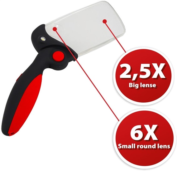 Obdélníková lupa se dvěma zvětšovacími čočkami 2,5x a 6x. Velká, skládací, přenosná, 1 vysoce výkonná LED dioda.Lampa na čtení pro seniory, knihy, mapy, šperky.Velká obdélníková čočka zvětšuje 2,5krát, zatímco malá čočka uprostřed zvětšuje 6krát, je vybavena 1 LED diodou SMD nejnovější generace