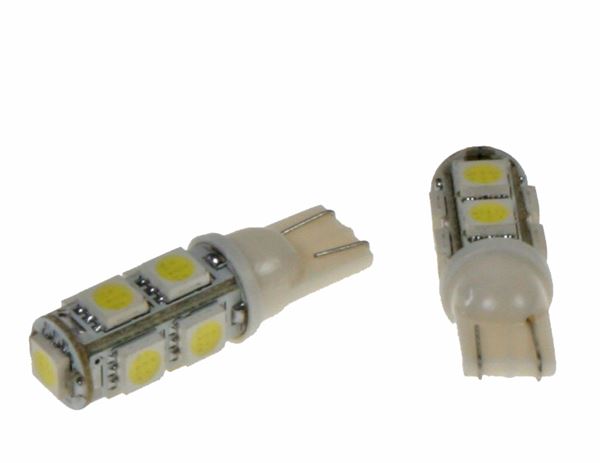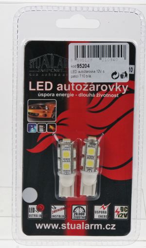 Náhradní LED žárovka s paticí T10, bílá, 9x vysocesvítivé 3-čipové SMD LED diody, napájecí napětí 12 V, vhodná do parkovacích světel u novějších vozidel, odpovídá žárovce "celosklo" W5W. Svítivost LED diody je podstatně větší než u žárovky 12 V 5 W. Díky teplotě světla 8000 K jsou LED žárovky ideálním doplňkem do reflektorů s xenonovými výbojkami, kde žluté světlo obyčejné žárovky působí rušivě.