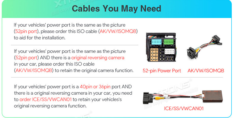 Pokud je napájecí port vašeho vozidla 40pinový nebo 36pinový port A ve vašem autě je originální couvací kamera, ht by xtram!!!! musíte si objednat ICE/SS/VWCANO, abyste zachovali původní funkci couvací kamery vašeho vozidla.