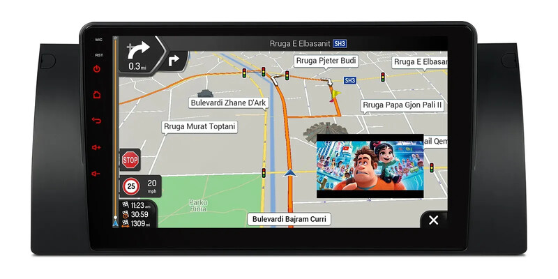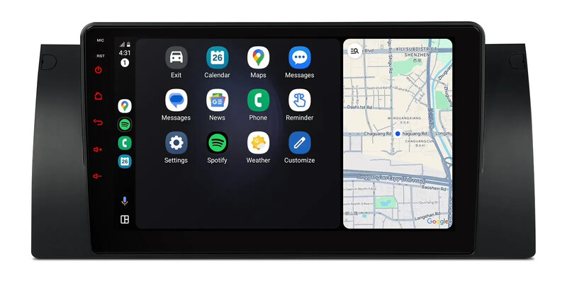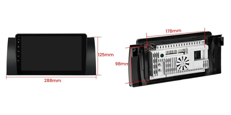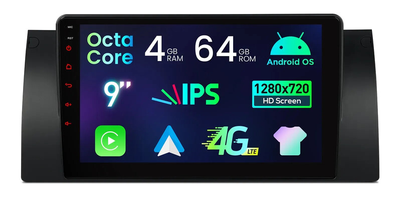 Optimalizovaný operační systém Android, osmijádrový procesor, 4 GB DDR4 RAM + 64 GB SSD ROM, 9" IPS displej s rozlišením 1280x720, GPS navigace, integrované 4G připojení, vestavěné funkce CarPlay a Android Auto a rádio SI4755 s RDS, zesilovač TCB001HQ, podpora AHD kamer, přehrávání videa v rozlišení 1080p pro BMW X5 E53