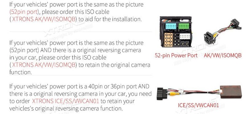 Pokud je napájecí port vašeho vozidla 40pinový nebo 36pinový port A ve vašem autě je originální couvací kamera, ht by xtram!!!! musíte si objednat ICE/SS/VWCANO, abyste zachovali původní funkci couvací kamery vašeho vozidla.
